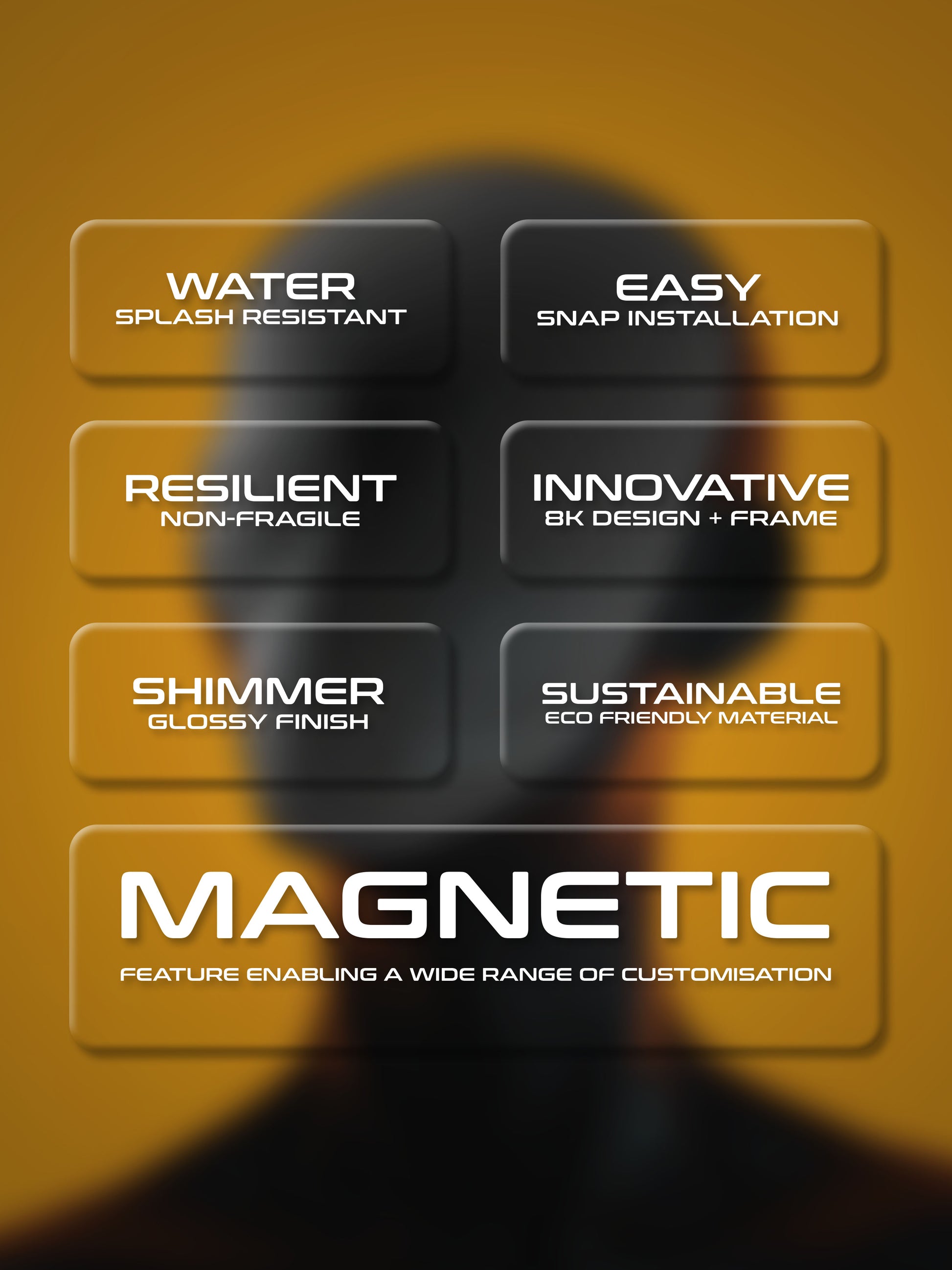 We craft each frame using top-notch materials in our own facility, ensuring quality from start to finish. Our frames boast a water-resistant surface, a hassle-free magnetic grip for easy installation, and durability without the fragility of glass. The high-resolution images are framed under acrylic borders, using sustainable materials to minimize environmental impact.