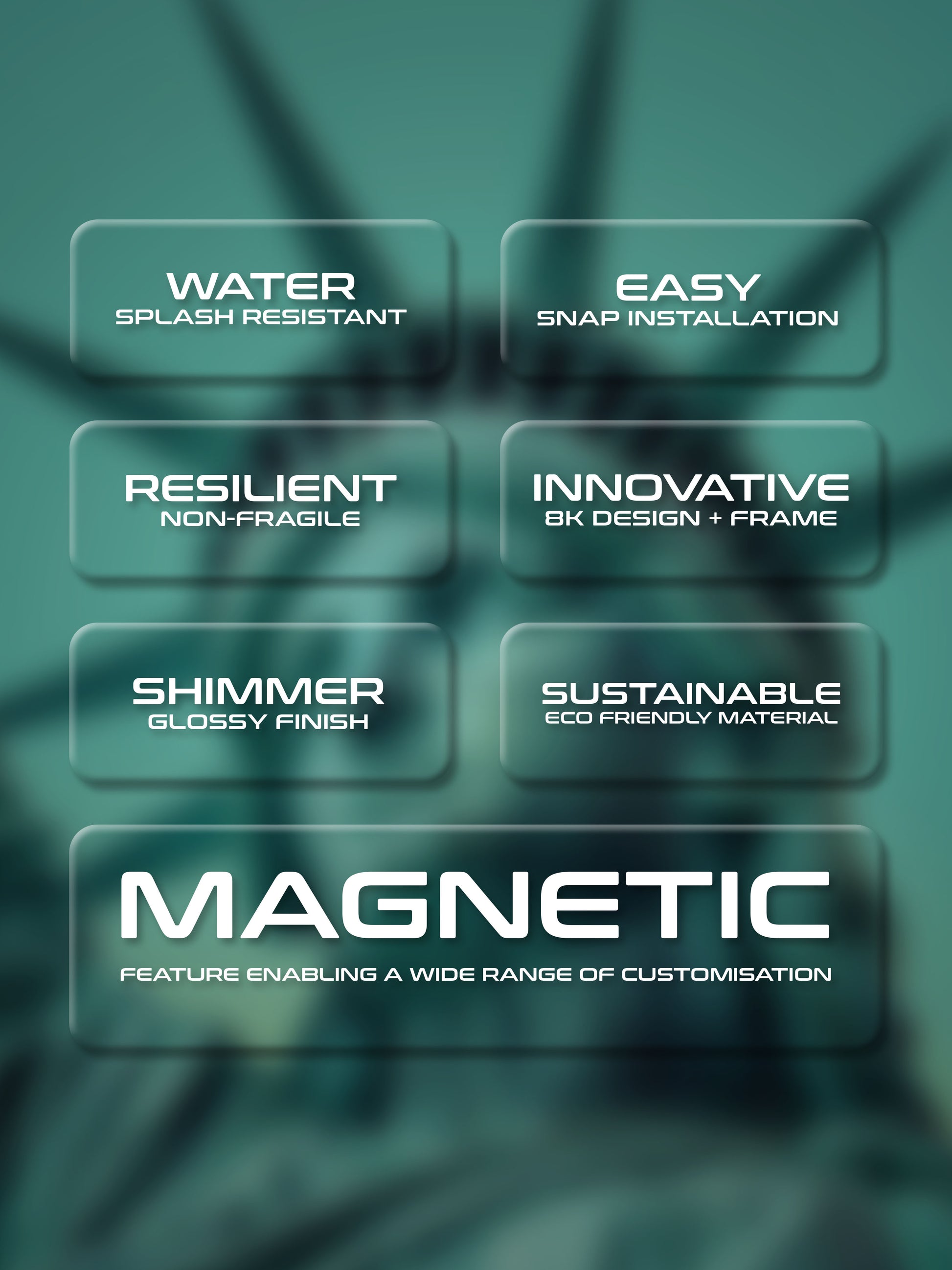 We craft each frame using top-notch materials in our own facility, ensuring quality from start to finish. Our frames boast a water-resistant surface, a hassle-free magnetic grip for easy installation, and durability without the fragility of glass. The high-resolution images are framed under acrylic borders, using sustainable materials to minimize environmental impact.