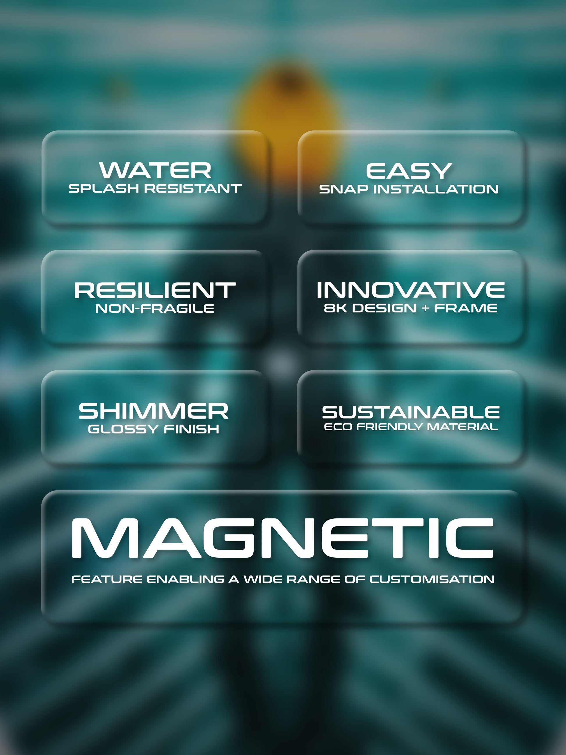 We craft each frame using top-notch materials in our own facility, ensuring quality from start to finish. Our frames boast a water-resistant surface, a hassle-free magnetic grip for easy installation, and durability without the fragility of glass. The high-resolution images are framed under acrylic borders, using sustainable materials to minimize environmental impact.