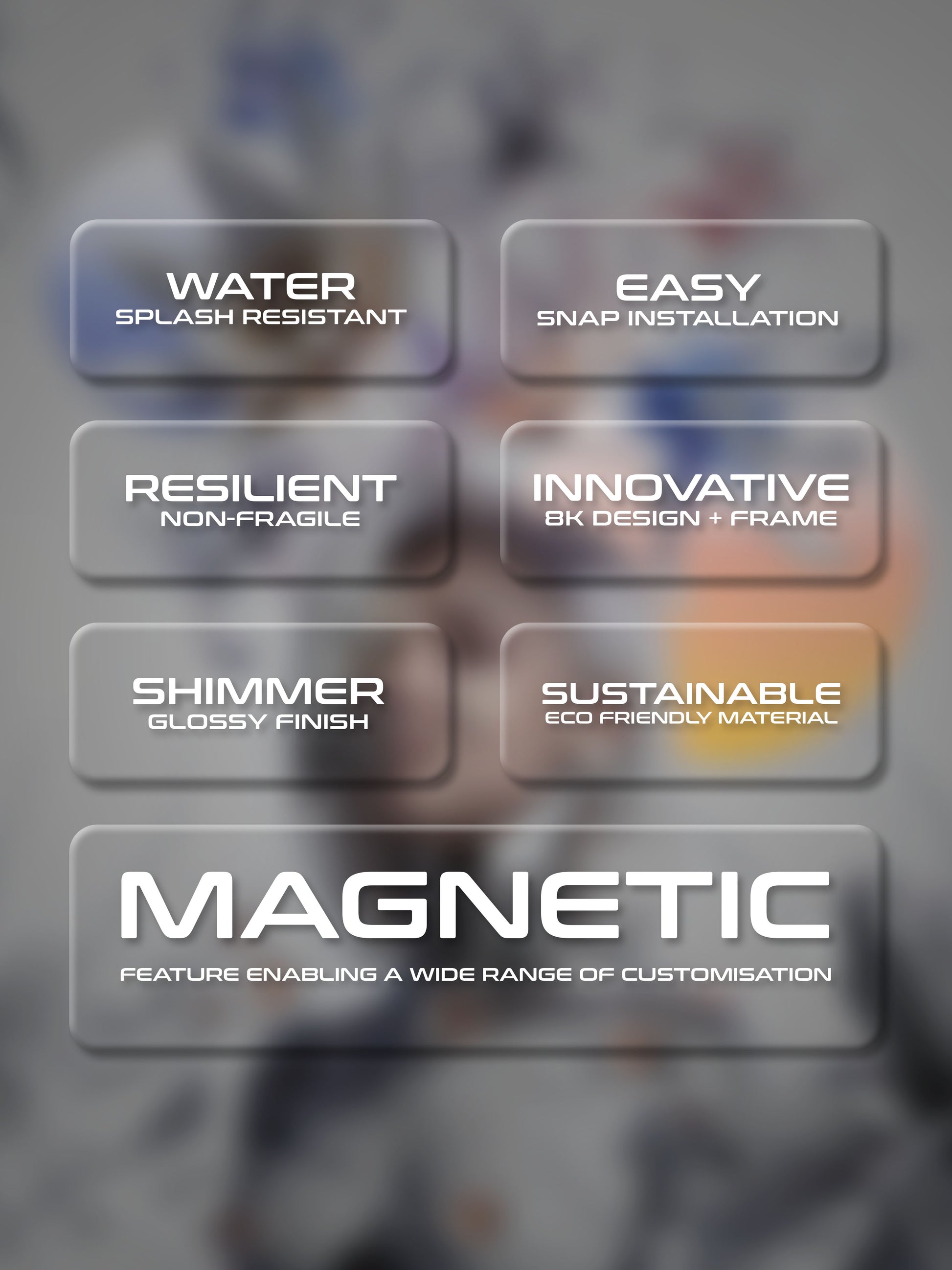 We craft each frame using top-notch materials in our own facility, ensuring quality from start to finish. Our frames boast a water-resistant surface, a hassle-free magnetic grip for easy installation, and durability without the fragility of glass. The high-resolution images are framed under acrylic borders, using sustainable materials to minimize environmental impact.
