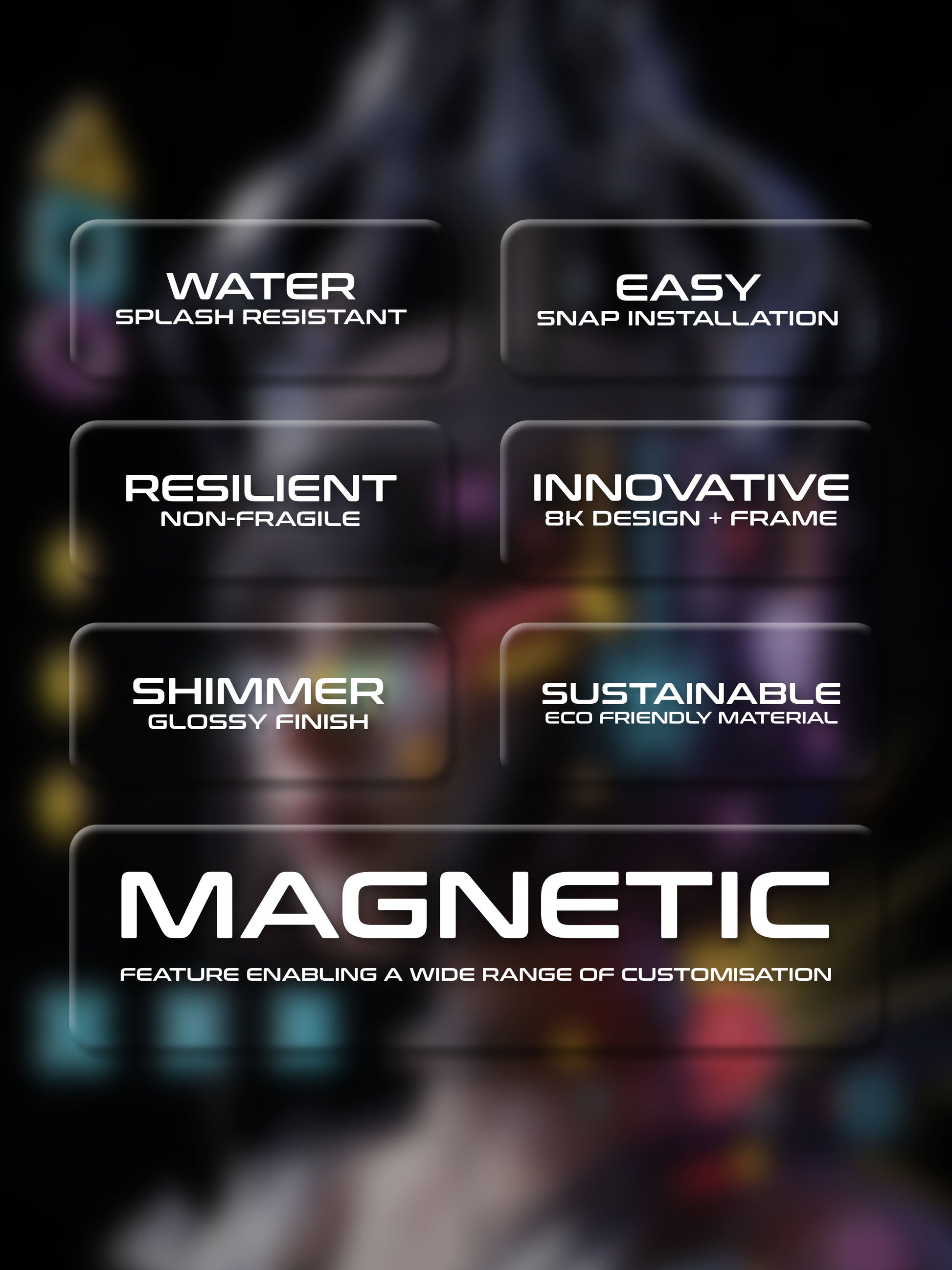 We craft each frame using top-notch materials in our own facility, ensuring quality from start to finish. Our frames boast a water-resistant surface, a hassle-free magnetic grip for easy installation, and durability without the fragility of glass. The high-resolution images are framed under acrylic borders, using sustainable materials to minimize environmental impact.