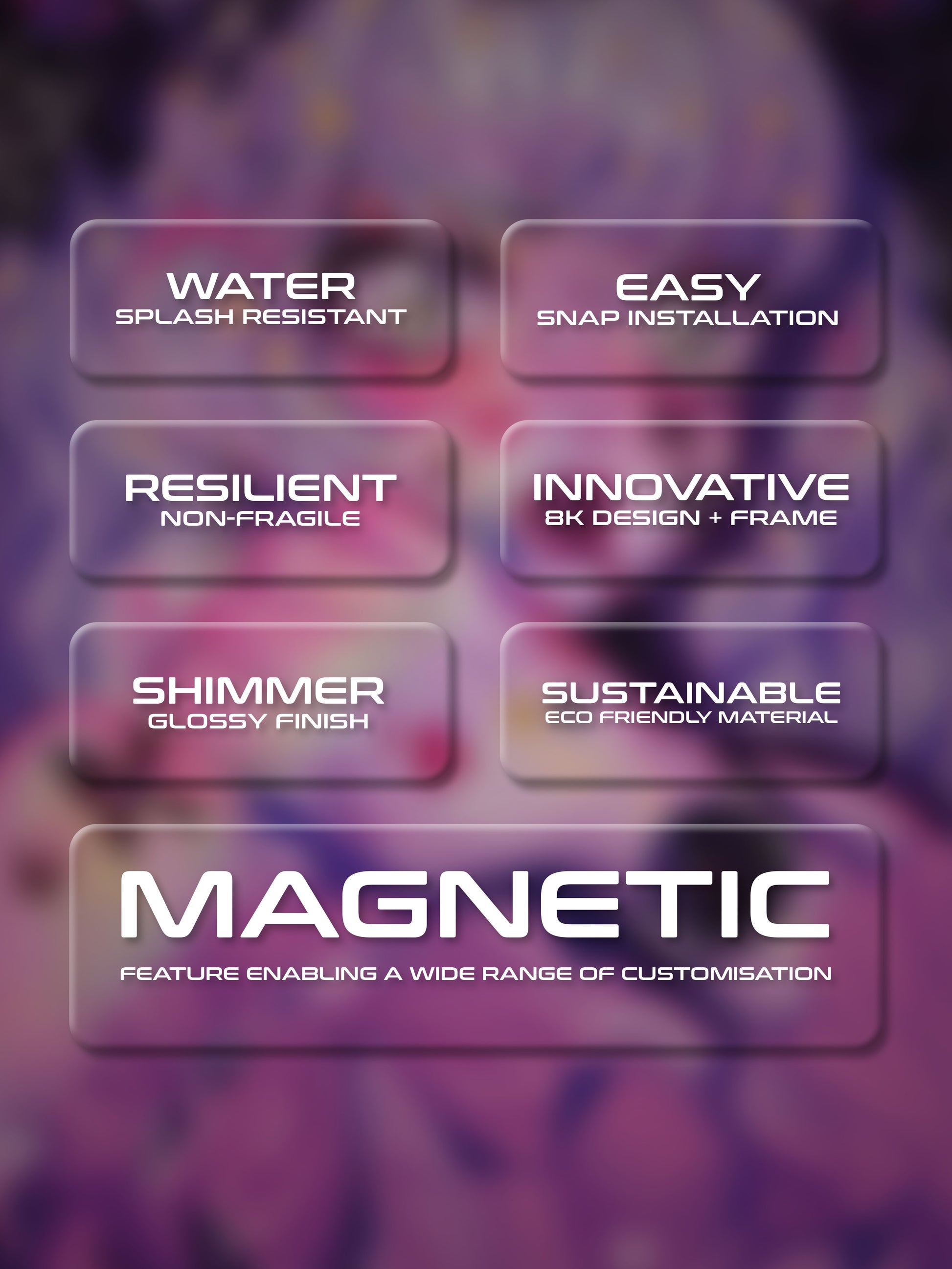 We craft each frame using top-notch materials in our own facility, ensuring quality from start to finish. Our frames boast a water-resistant surface, a hassle-free magnetic grip for easy installation, and durability without the fragility of glass. The high-resolution images are framed under acrylic borders, using sustainable materials to minimize environmental impact.
