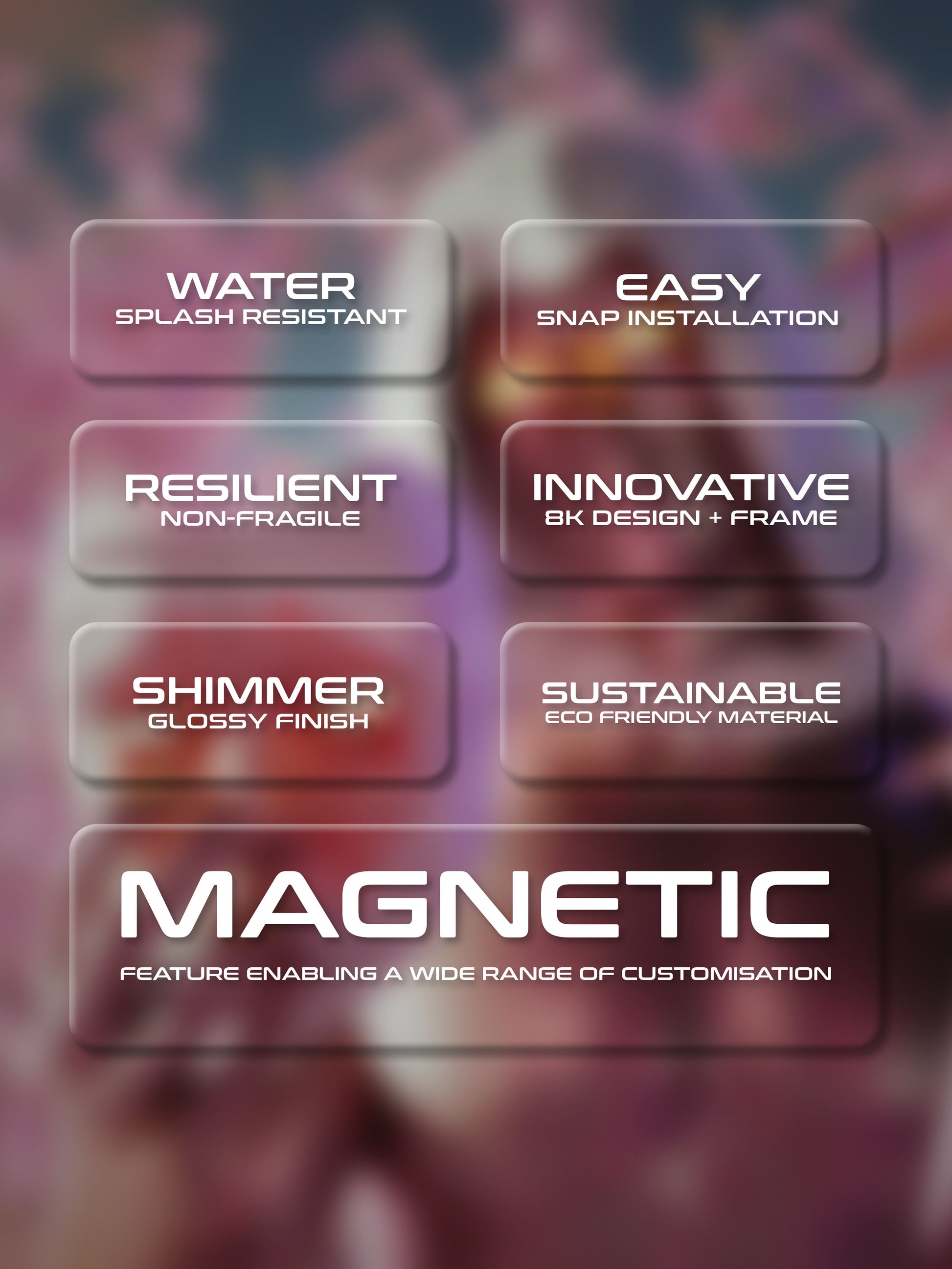 We craft each frame using top-notch materials in our own facility, ensuring quality from start to finish. Our frames boast a water-resistant surface, a hassle-free magnetic grip for easy installation, and durability without the fragility of glass. The high-resolution images are framed under acrylic borders, using sustainable materials to minimize environmental impact.