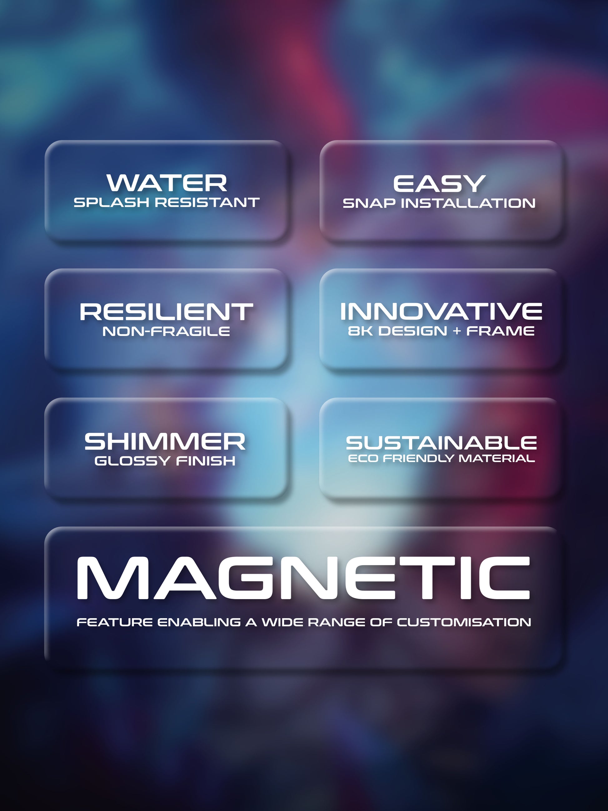 We craft each frame using top-notch materials in our own facility, ensuring quality from start to finish. Our frames boast a water-resistant surface, a hassle-free magnetic grip for easy installation, and durability without the fragility of glass. The high-resolution images are framed under acrylic borders, using sustainable materials to minimize environmental impact.