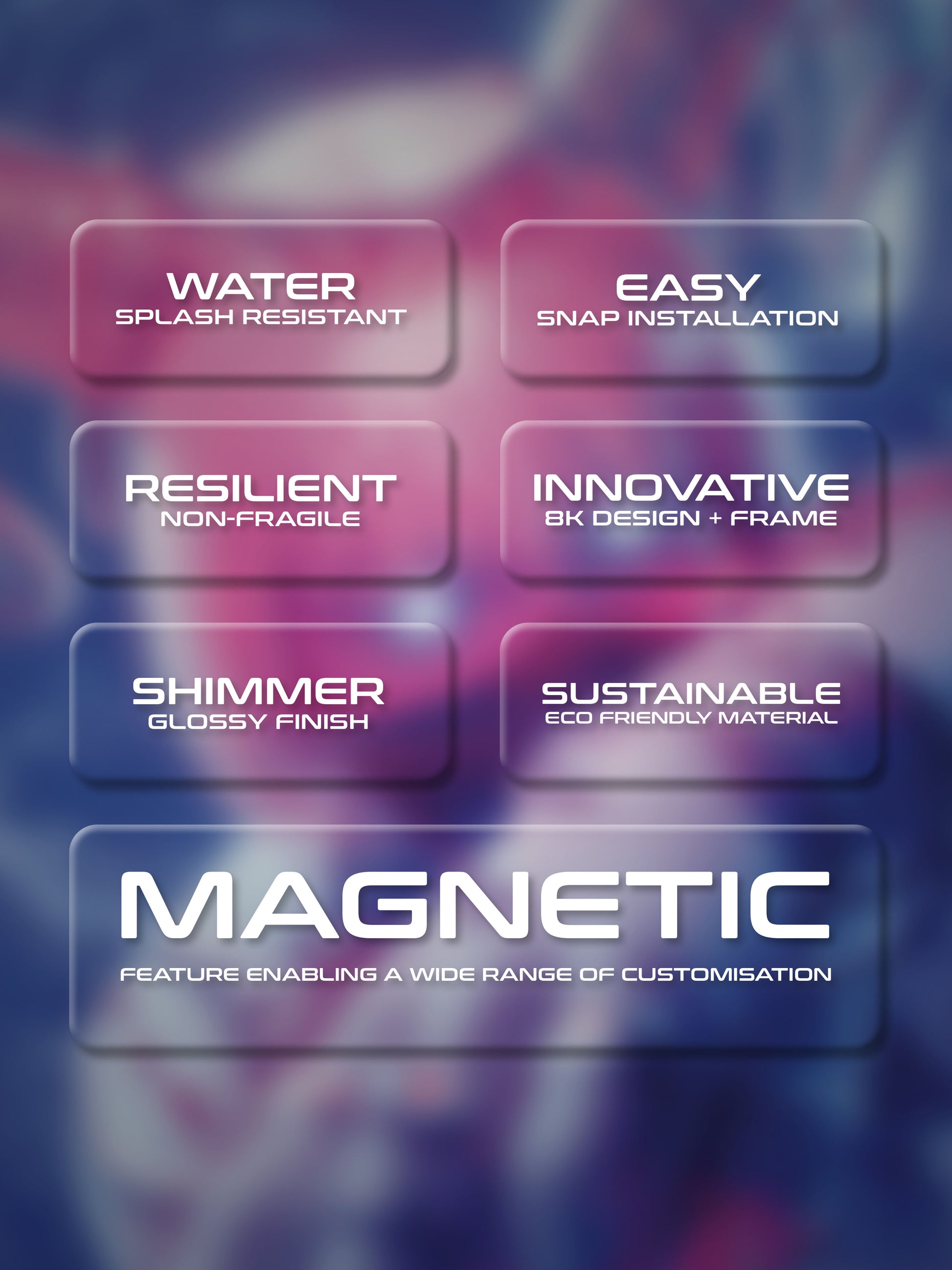 We craft each frame using top-notch materials in our own facility, ensuring quality from start to finish. Our frames boast a water-resistant surface, a hassle-free magnetic grip for easy installation, and durability without the fragility of glass. The high-resolution images are framed under acrylic borders, using sustainable materials to minimize environmental impact.