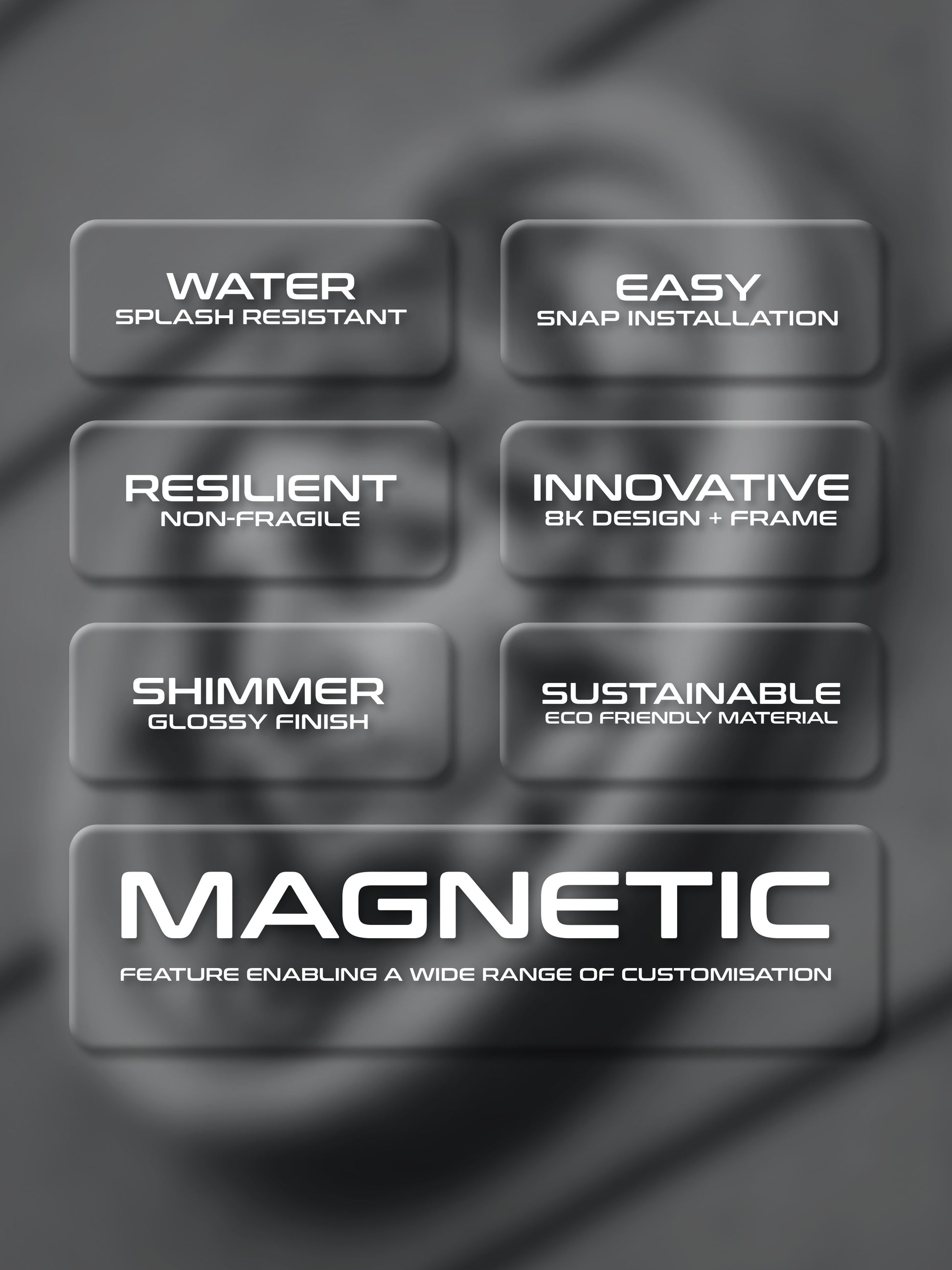We craft each frame using top-notch materials in our own facility, ensuring quality from start to finish. Our frames boast a water-resistant surface, a hassle-free magnetic grip for easy installation, and durability without the fragility of glass. The high-resolution images are framed under acrylic borders, using sustainable materials to minimize environmental impact.