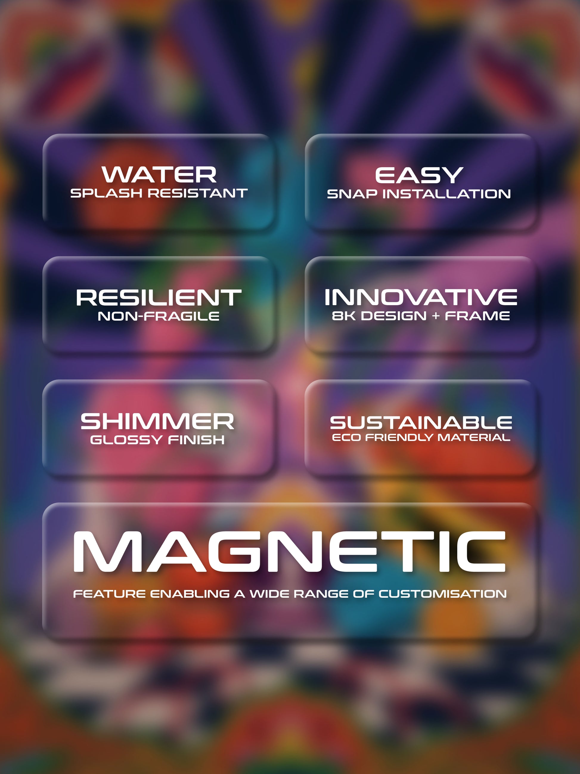 We craft each frame using top-notch materials in our own facility, ensuring quality from start to finish. Our frames boast a water-resistant surface, a hassle-free magnetic grip for easy installation, and durability without the fragility of glass. The high-resolution images are framed under acrylic borders, using sustainable materials to minimize environmental impact.