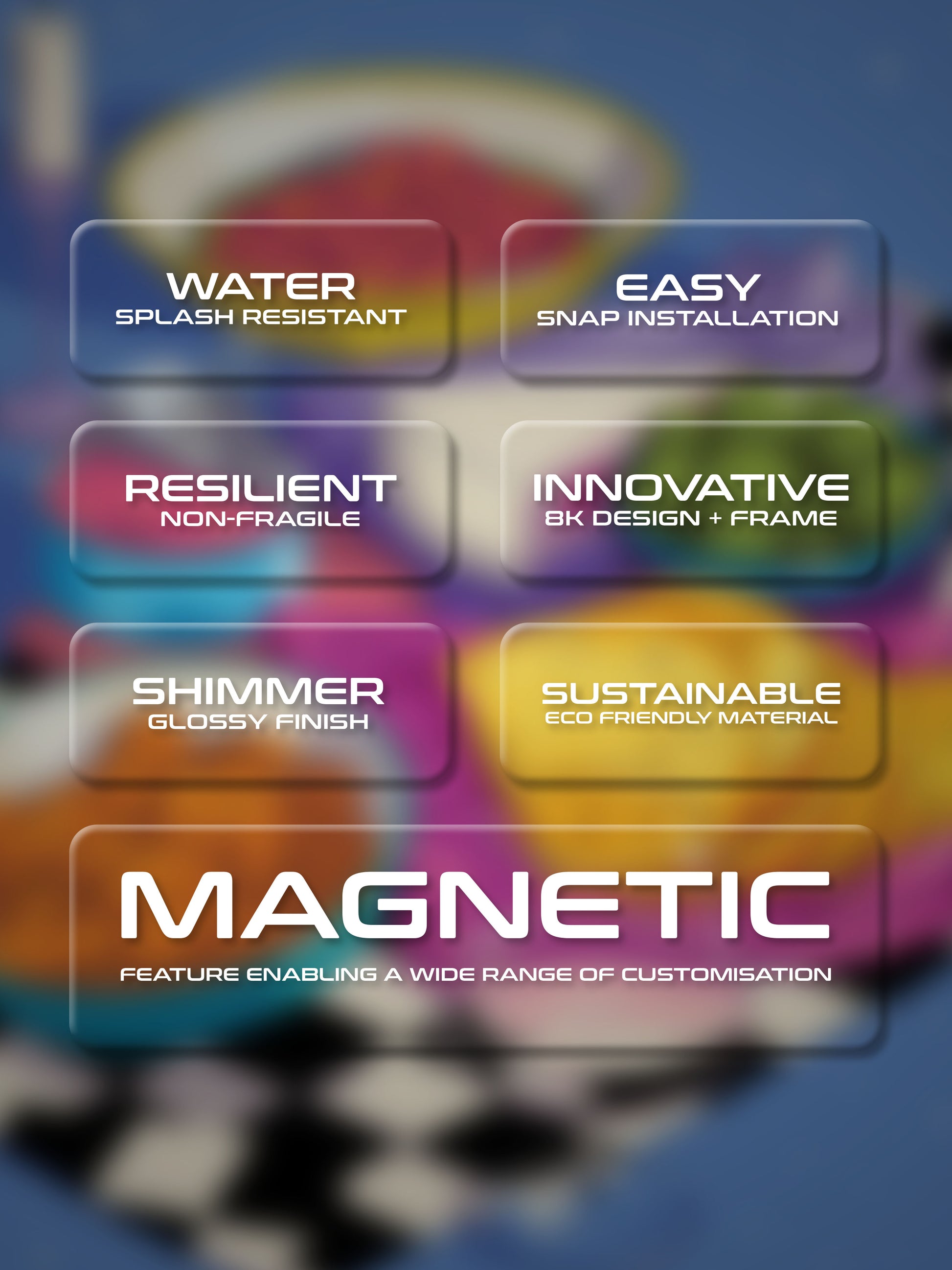 We craft each frame using top-notch materials in our own facility, ensuring quality from start to finish. Our frames boast a water-resistant surface, a hassle-free magnetic grip for easy installation, and durability without the fragility of glass. The high-resolution images are framed under acrylic borders, using sustainable materials to minimize environmental impact.