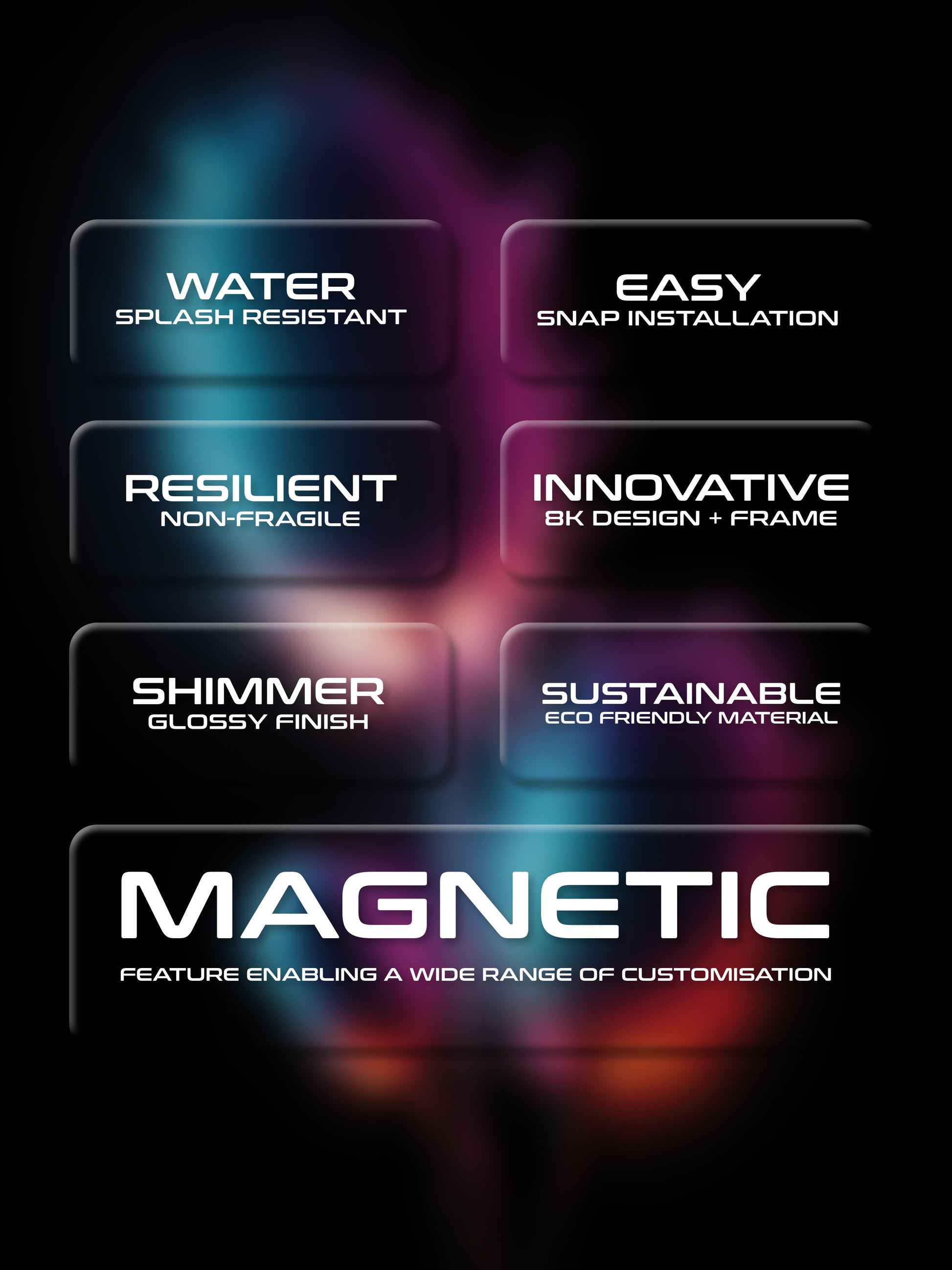We craft each frame using top-notch materials in our own facility, ensuring quality from start to finish. Our frames boast a water-resistant surface, a hassle-free magnetic grip for easy installation, and durability without the fragility of glass. The high-resolution images are framed under acrylic borders, using sustainable materials to minimize environmental impact.