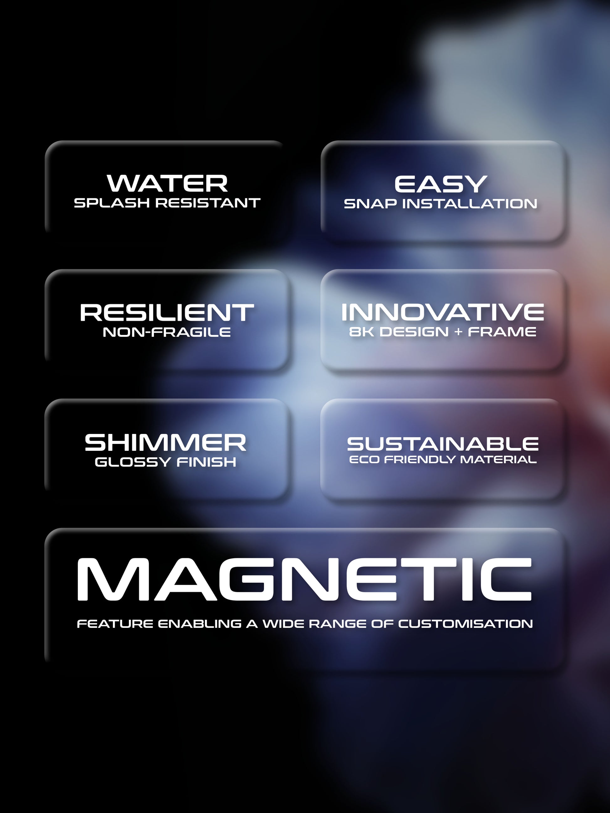 We craft each frame using top-notch materials in our own facility, ensuring quality from start to finish. Our frames boast a water-resistant surface, a hassle-free magnetic grip for easy installation, and durability without the fragility of glass. The high-resolution images are framed under acrylic borders, using sustainable materials to minimize environmental impact.