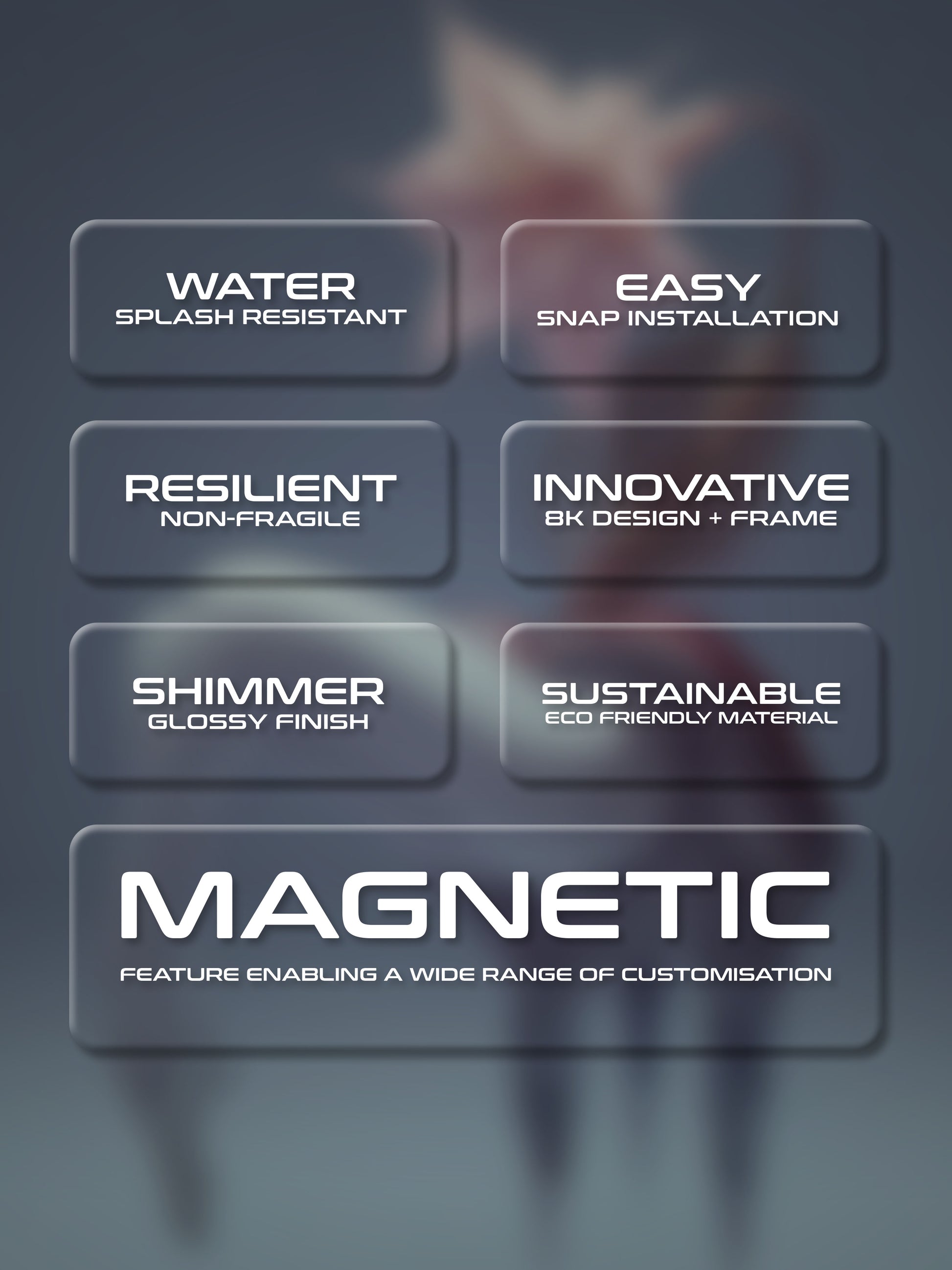 We craft each frame using top-notch materials in our own facility, ensuring quality from start to finish. Our frames boast a water-resistant surface, a hassle-free magnetic grip for easy installation, and durability without the fragility of glass. The high-resolution images are framed under acrylic borders, using sustainable materials to minimize environmental impact.