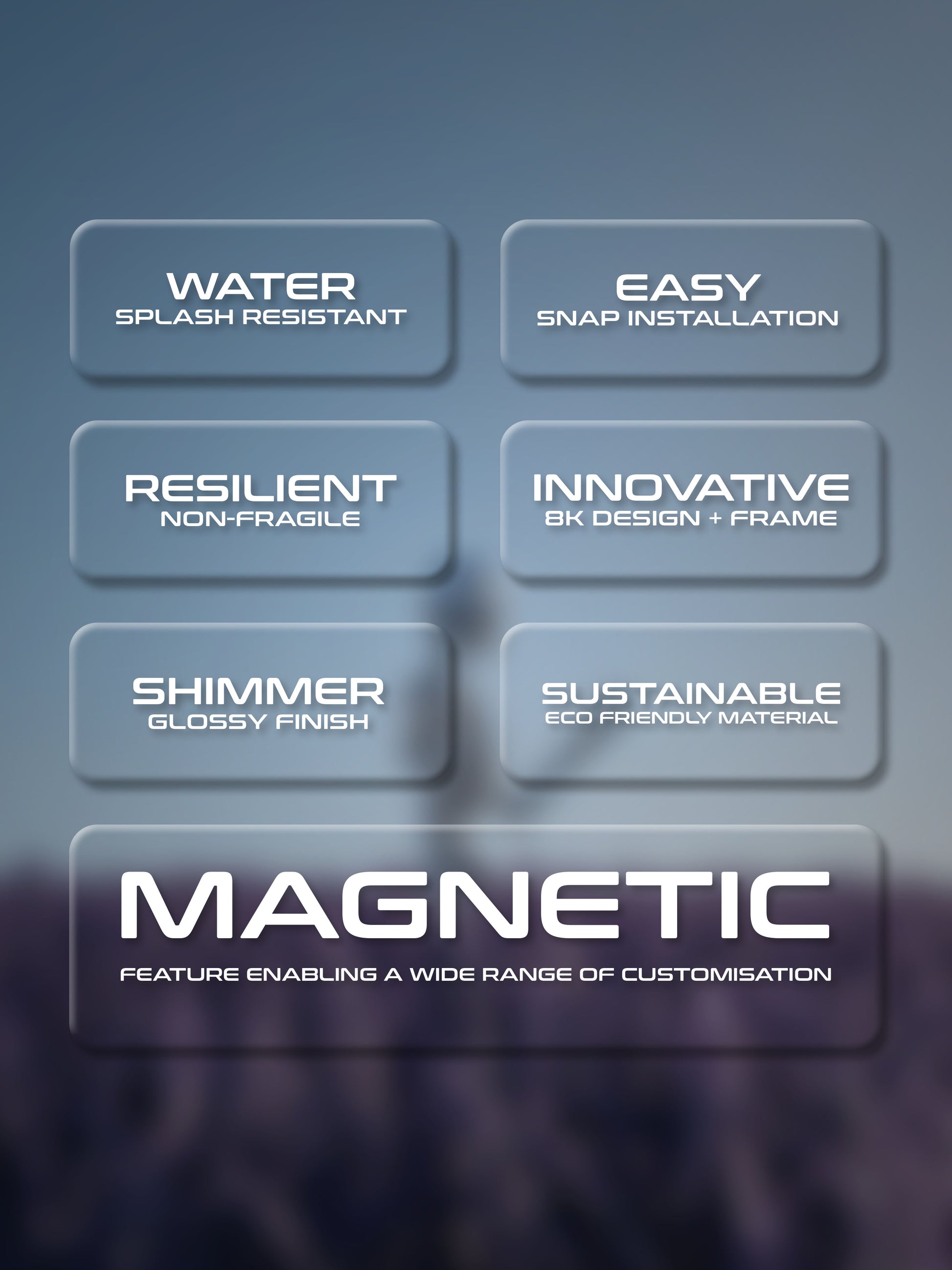 We craft each frame using top-notch materials in our own facility, ensuring quality from start to finish. Our frames boast a water-resistant surface, a hassle-free magnetic grip for easy installation, and durability without the fragility of glass. The high-resolution images are framed under acrylic borders, using sustainable materials to minimize environmental impact.