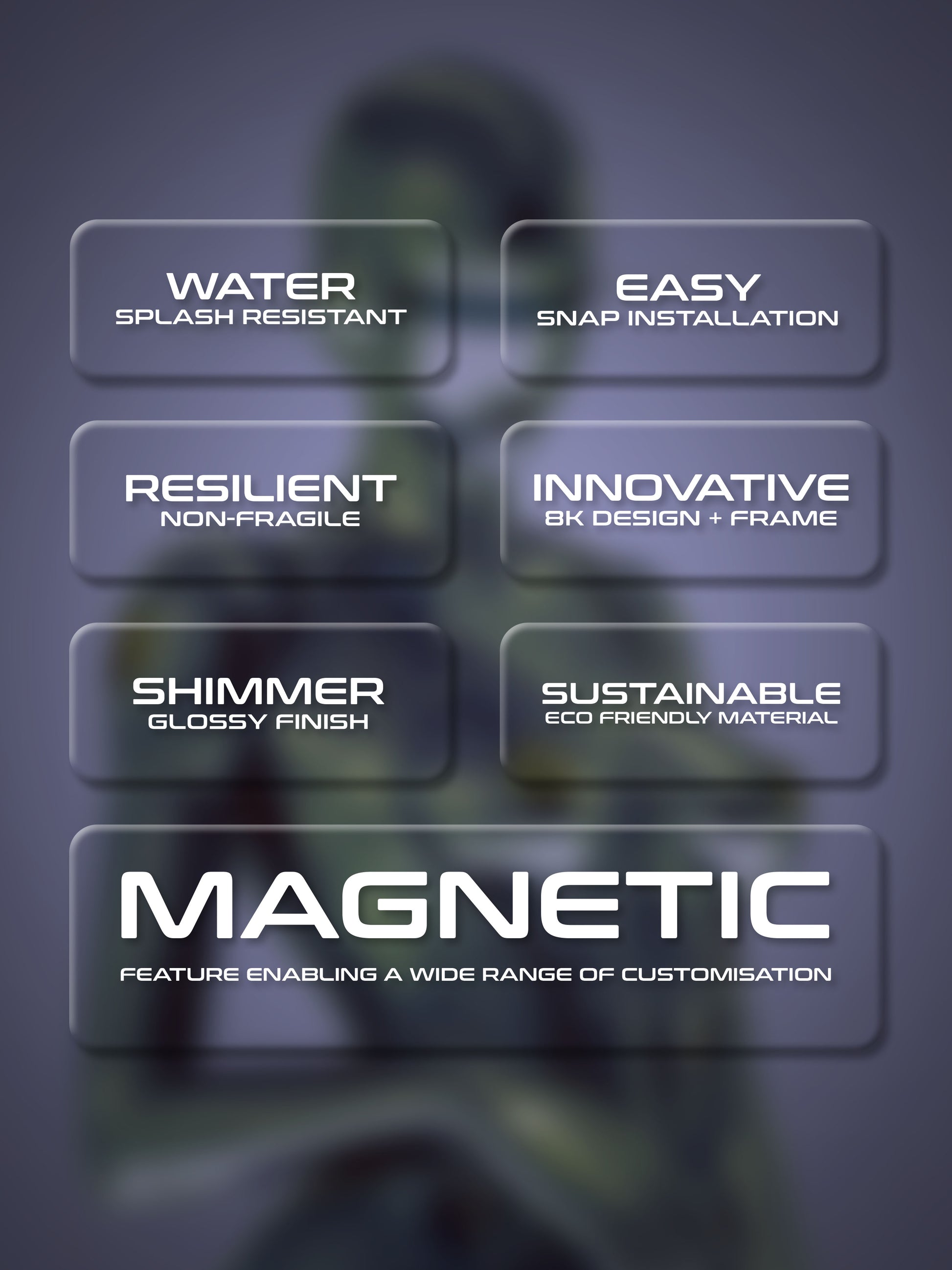 We craft each frame using top-notch materials in our own facility, ensuring quality from start to finish. Our frames boast a water-resistant surface, a hassle-free magnetic grip for easy installation, and durability without the fragility of glass. The high-resolution images are framed under acrylic borders, using sustainable materials to minimize environmental impact.